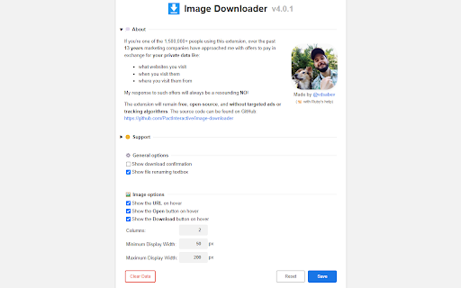 Image Downloader ━━━━━━━━━━ To save multiple photos at once, this extension enables you to: - Browse pictures on the active webpage - Filter by size, dimensions, or URL - Download or view any single photo with one click - Save to a subfolder - Rename downloaded files - Download in the background! Note: If no default download folder is set, you’ll need to choose a save location for each photo, which may trigger multiple popups. Configure a download directory in your browser settings for a smoother experience. ❓ FAQs ━━━━ Why does this extension need access to all site data? To extract photos from a webpage, Image Downloader must access all content when the popup is activated. No data is sent off your device. See our Privacy Policy for details: https://pactinteractive.github.io/image-downloader Why were some downloaded photos smaller or missing? Image Downloader only retrieves photos currently displayed on the page, which may be thumbnails rather than full-resolution versions (e.g., in Facebook albums). Some sites, like Instagram, load only a few pictures at a time in carousels to save bandwidth. We’re exploring ways to improve Image Downloader’s capabilities. For now, consider using extensions tailored to specific sites (e.g., Facebook) for advanced functionality.